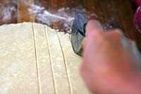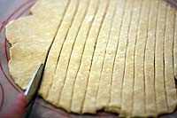 Cortar la masa en tiras incluso, tiras de 1/2 pulgada a 3/4-pulgada de ancho, dependiendo de cómo de espesor desea su enrejado. Puede utilizar un cuchillo embotado con o sin una regla o escuadra para guiarte, o puede utilizar un disco de pizza o una rueda de masa si tienes uno.