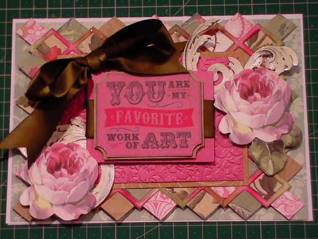 La tarjeta es un proyecto realmente bonito con adorno floral color rosa y tarjeta de relieve para crear un impresionante telón de fondo a un sentimiento y una cinta que fluye.