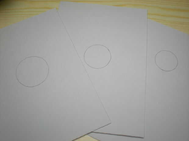 En primer lugar, usted necesita dibujar círculos de diferentes tamaños en el centro de tres pedazos de papel. Usé círculos de 7, 6 y 5 cm de diámetro.