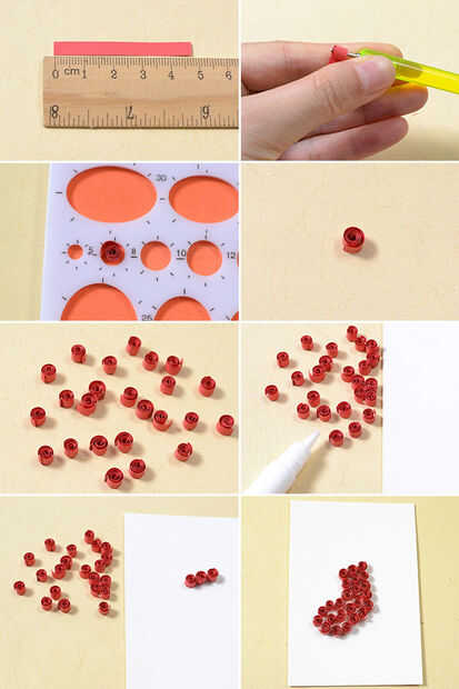 1, corte suficientes piezas de 5mm quilling papeles (unos 5cm de largo), luego hacerlas rodar con un lápiz rodante uno por uno;