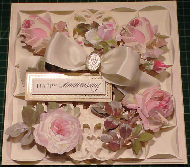 Esta tarjeta es totalmente hermosa, tiene un poco de todo y no puedo decir va a ser una tarjeta rápida pero puedo decir es una 'maravilla'! y quien lo recibe lo mantendrá para siempre... La tarjeta tiene un papel doblado edredón estilo fondo del kit de Anna Griffin papel Tricks2 y ello crea algo impresionante para las flores 3D y sentimiento para sentarse, así como el arco deslumbrante y adorno... perfecto para algo grande y si alguna vez has querido una tarjeta para hacer una declaración, entonces esto se va.