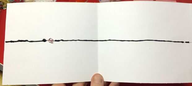 Cuidadosamente la pintura una línea con la tinta conductora. Asegúrese de hacer una gota grande en cada extremo. Meter el LED a través del papel y coloque los cables sobre la línea, añadir otra gota de tinta en cada extremo de los hilos de pegamento abajo.