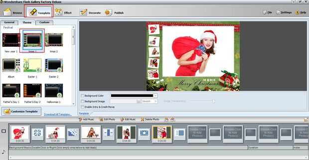 Seleccione "Plantilla" y vaya a "Tema". Como se puede ver, varias plantillas de tarjeta de flash bien diseñado están disponibles. Aquí usted puede elegir una plantilla de tarjeta de Navidad te gusta o personaliza su propio. Haga clic aquí para conseguir plantillas de diapositivas flash más impresionantes.