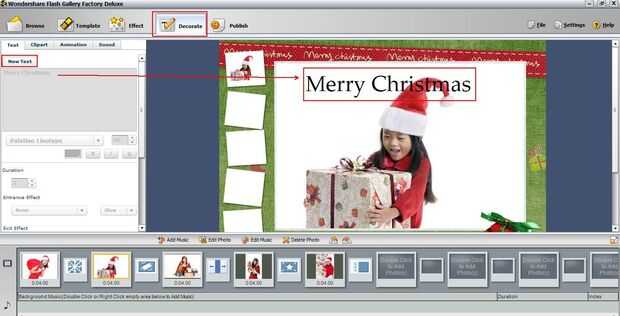 Si quieres agregar palabras a la tarjeta de Navidad, ir a la pestaña de "Decorar" y escriba todo lo que quieras decir en el cuadro de texto. Entonces usted puede hacer sus textos más singulares cambiando ajustes como fuente, tamaño, color, efecto de texto y más. Todo depende de usted!