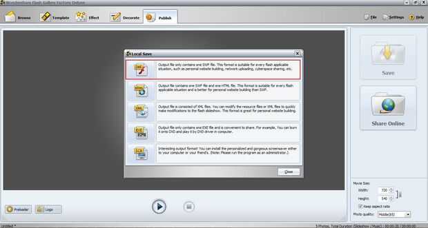Después de decorar su tarjeta flash, vaya a la pestaña "Publicar" y haga clic en el icono de "Play" para escucharlo. Haga clic en "Configuración de publicación", primero cambiar el tamaño de presentación así como el tamaño de tus fotos y otros ajustes como control, usted puede dejarlas si no necesita cambiar. Después de eso, haga clic en "Guardar" botón para guardar su tarjeta flash como SWF, HTML, XML, EXE o salvapantallas. Usted puede también hacer clic en "Share Online" para enviar la postal por correo electrónico a tus amigos y familiares. Vea la demo flash