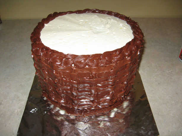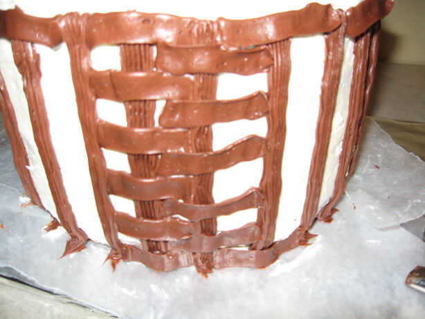 OK, ahora necesitas un bolso de helar con 2 puntas. Un Consejo para las líneas verticales redondos y una punta rectangular para hacer las líneas horizontales. (hay otros estilos de la armadura de cesta por ahí, éste me dejó cubrir el pastel más rápido puesto que las líneas son más grandes).