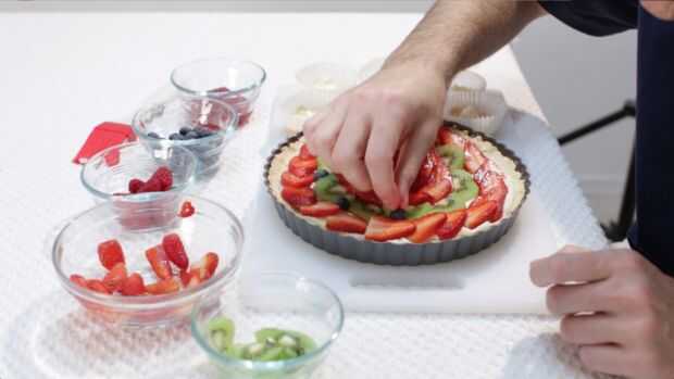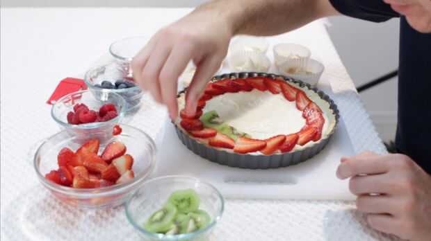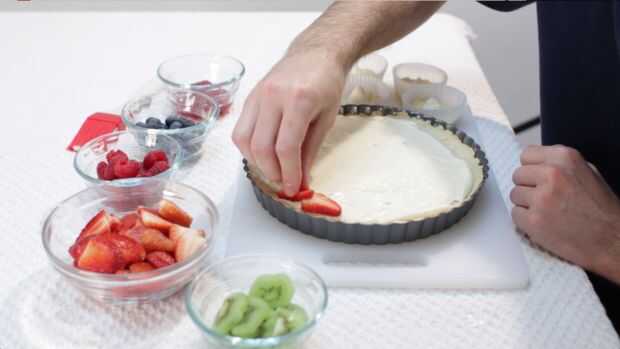 Ahora agregamos nuestros toppings de la fruta. Puede utilizar cualquier toppings de fruta te gusta. Mis favoritos son fresas, arándanos, frambuesas y kiwi. Coloque las frutas sin embargo como en la parte superior. Después de todo es tu tarta. :)