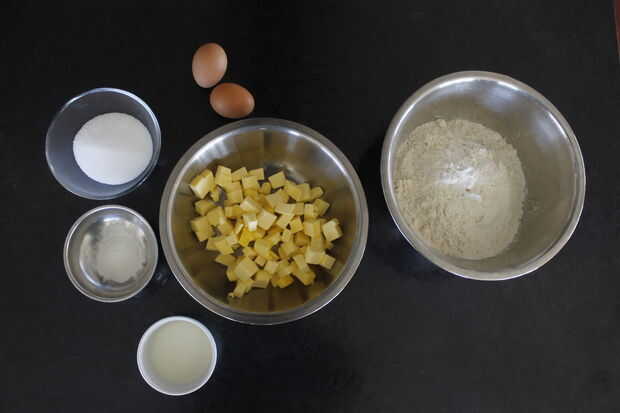 Paso 1: Reunir todos los ingredientes Necesita:2 tazas de harina1/4 taza de azúcar4 cucharaditas de polvo de hornear1/2 cucharadita de salpocos granos de nuez moscada1 huevo, bien batido6 cucharadas de mantequilla fría1/3 taza de lechefresas en rodaj