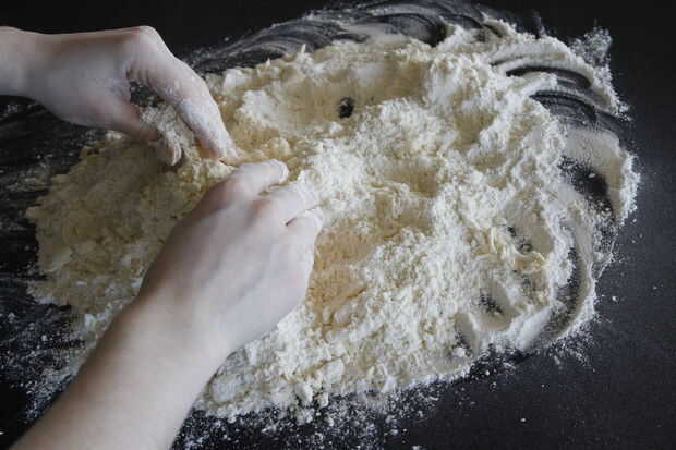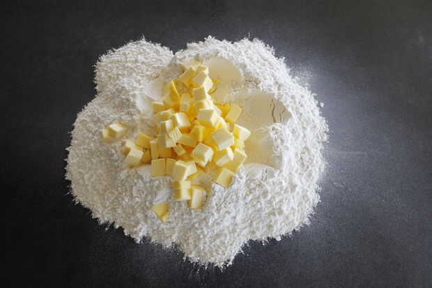 Paso 1: Reunir todos los ingredientes Necesita:2 tazas de harina1/4 taza de azúcar4 cucharaditas de polvo de hornear1/2 cucharadita de salpocos granos de nuez moscada1 huevo, bien batido6 cucharadas de mantequilla fría1/3 taza de lechefresas en rodaj