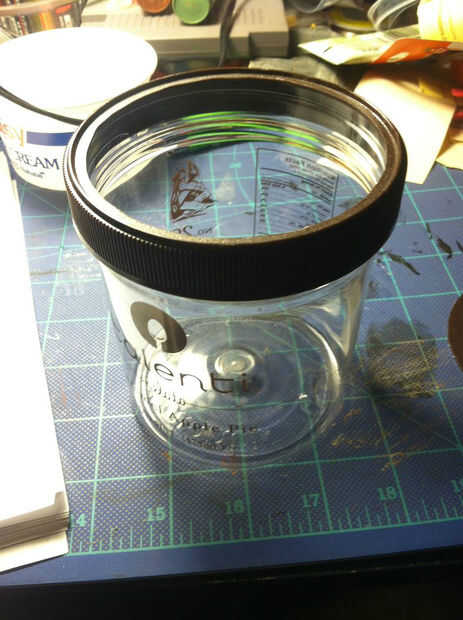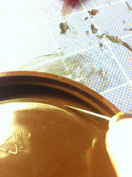 Primer paso es cortar un agujero en el encendido de la jarra. En la primera y la segunda imagen verás donde tienes que cortar para obtener la parte superior de la jarra para alinear con el nuevo agujero en la tapa. Agarra la navaja xacto o cuchillo caliente o lo que sea que desee utilizar para cortar el plástico y manos a la obra!