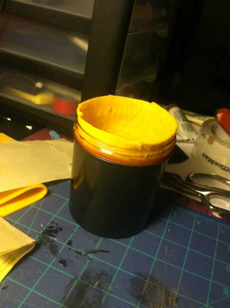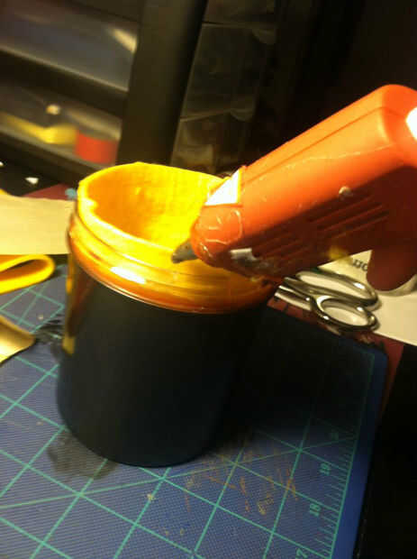 Una vez que la parte inferior se pega en caer la pieza lateral en la Copa. Me pareció más fácil de pegar en secciones. Sólo mueva el fieltro fuera del camino y poner una gota del pegamento de la parte inferior a superior y luego pegar el fieltro hacia abajo. Enjuague y repita hasta que el fieltro se pega hacia abajo. Ahora puede recortar el fieltro, doblar el borde sobre y péguelo a la parte superior.