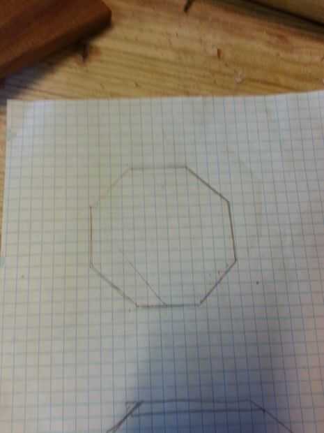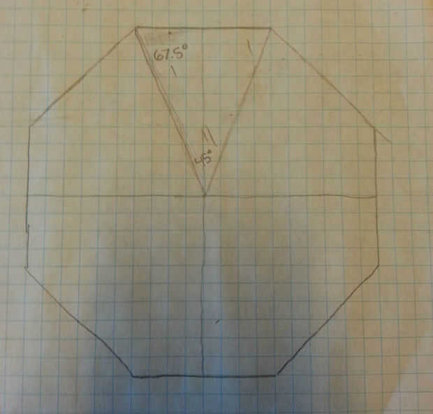 El siguiente paso es averiguar en cuántas partes quieres. Ocho desea ocho lados. Es más fácil y atractivo, proportion-wise. Entonces invocas a un demonio (también conocido como hacer matemáticas) para encontrar el ángulo que el corte va a ser.