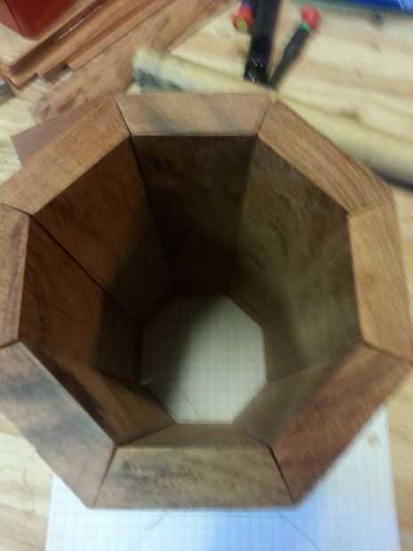 Tan para esta taza estilo realmente se compensa la parte inferior de la base de la taza. Siempre me encanta este look, y se añade una llamarada de aspecto profesional a la taza cuando usted bebe de ella un ver que aplica sangría. Para ello de que primero debe decidir cómo lejos la base de la parte inferior será, aproximadamente 3/4 de pulgada. Luego ajustar la Sierra de mesa en consecuencia un corte cada pieza del mismo ancho que el espesor de la madera se utiliza para la parte inferior y levante la hoja sólo aproximadamente 1/4 de pulgada que será del mismo grosor que compensar la pieza inferior. Después dos trozos de cinta en las partes posterioras de las piezas y tire de ellas todos juntos y asegúrese de que esté bien apretada. Entonces desde el interior traza en un trozo de papel. Entonces compensar aproximadamente 1/4 de pulgada hacia fuera para que pueda moverse en las piezas. Luego trazar sobre la pieza inferior y recortarlo. Luego probarlo y asegurarse de que todo encaje perfectamente. Bandas de goma ayudan a mantener juntos mientras asegurándose de que todo encaja bien.