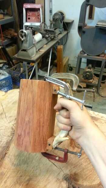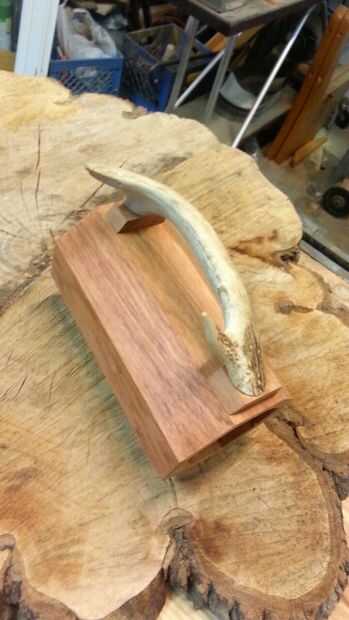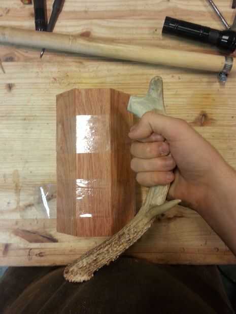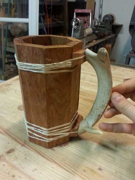 Corte su cornamenta al tamaño correcto para su mango primero asegúrese de que ambos lados se alinean mediante el uso de la lijadora. Decidir donde usted lo desee. Usar piezas de la marca de ángulo Junta montaje de bloques para la manija. Luego perfore un agujero y contador de lavabo en la parte posterior de las piezas así que usted puede atornillar los bloques en la cornamenta. Atornille los bloques en la cornamenta, poner un poco de pegamento entre ellos. Luego perfore orificios piloto pequeño los bloques en los lados del ángulo para que las tachuelas se pondrá en la taza. Luego pega los bloques a la taza y del martillo en los clavos. Luego sujete el asa a la taza y deje que se seque, limpiar y el exceso de pegamento.