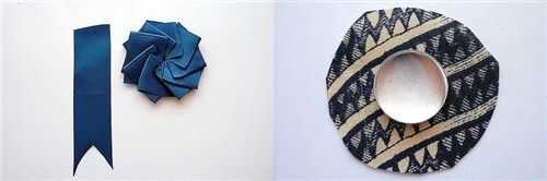 Corte una tira de cinta; recortar un triángulo en la parte inferior de la cinta. Envuelva un botón por una tela redonda; pegamento para hacer un botón de paño.