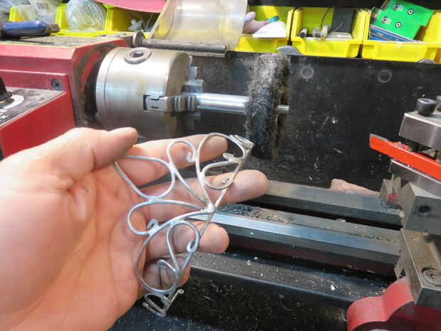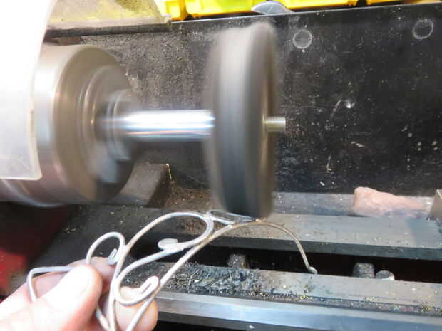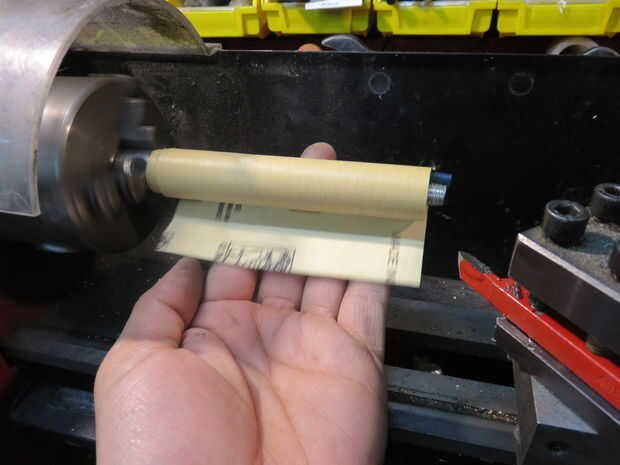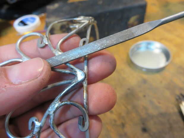 Algunos de mis articulaciones tenían demasiada soldadura. Yo archivé el exceso. Después me tiraron un bar en mi torno y envuelto en papel de lija alrededor de él con un trozo de cinta. Esto quita cualquier marca desigual del proceso de quema. Por último, había pulido con pulidor compuesto de una rueda que pulimenta.