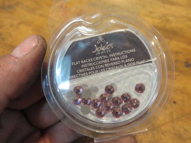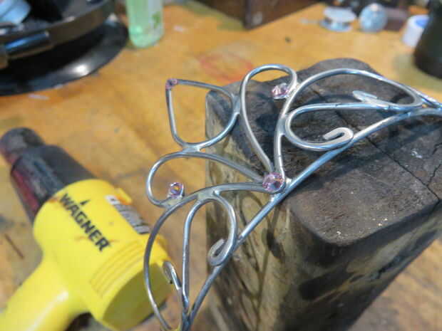 Estos cristales tienen una pequeña cantidad de pegamento de calor activado en sus espaldas. Me gusta utilizar una pistola de calor para conseguir bastante caliente mientras sostengo con una herramienta. Hice esta pequeña herramienta especial de una concha de bala. ¿No es eso gracioso? ¿Conchas de bala y tiaras? Suena como otro proyecto o TV show.