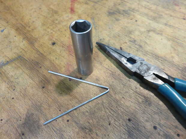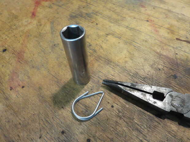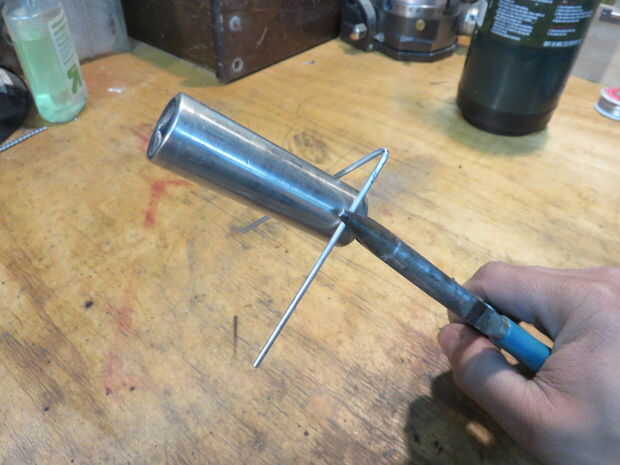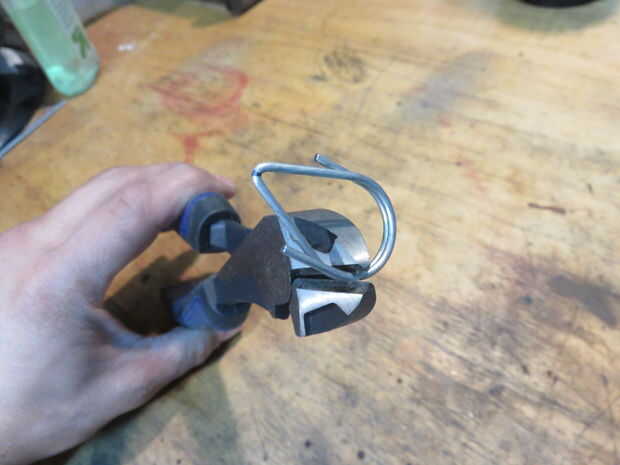 Para el lóbulo centro, doblar lo otros 6" pieza por la mitad a unos 45 grados. Adivinar el punto medio esta OK ya que los extremos libres se recortará. Tomar una toma de corriente y forman la parte inferior sosteniendo con unas pinzas y doblado alrededor de la toma. Corte los extremos libres en el lado izquierdo inferior "esquina" del lóbulo. Presentar los extremos para que preparar.