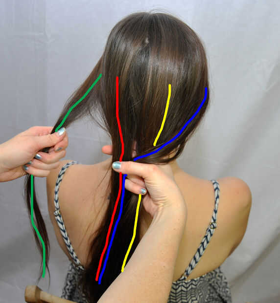 - Llevar esa pequeña sección de cabello (azul) en la parte superior de la sección derecha (amarillo), bajar entre las dos secciones y luego añadirlo al interior de la sección izquierda (rojo).