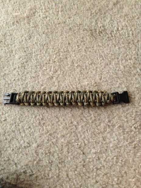Esta pulsera está hecha con 550 paracord. Destruyó los cables de trabajo para que le daría un aspecto más plano, más femenino. Pero, igual funciona sin destripar el cable. No se destruyó el núcleo central. He encontrado que haciéndolo de esta manera