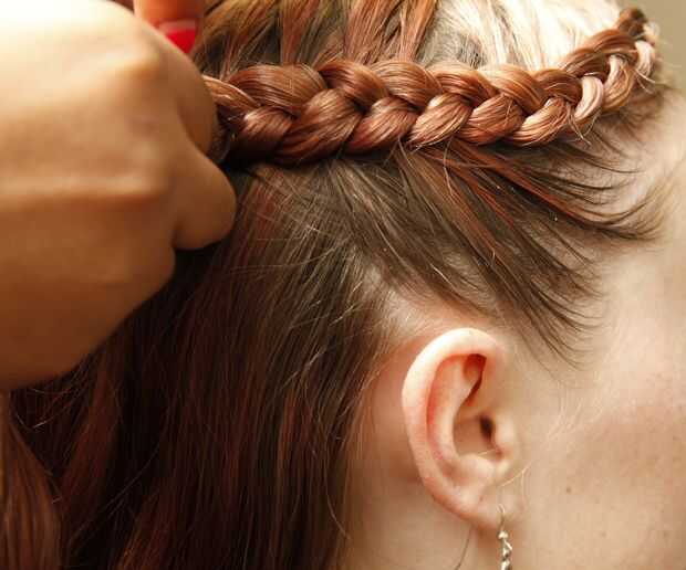 Llegar a la punta de la ceja, una vez la trenza y a partir de llevar a lo largo de la parte posterior de la cabeza hacia la oreja opuesta (izquierda). Esto le ayudará a evitar la abultada trenza justo detrás de la oreja.
