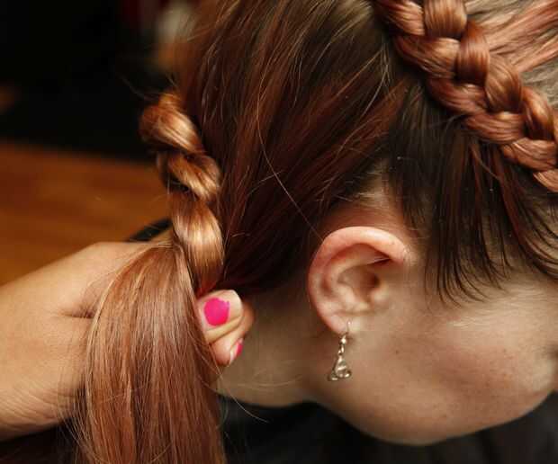 Ahora vas a continuar la trenza en la parte inferior de la línea del cabello. Continuaremos a agarrar por encima de la trenza.
