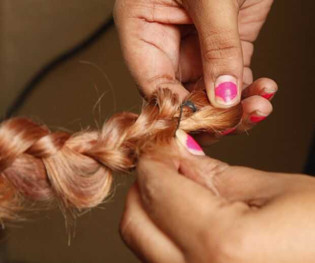 Banda de goma al final. Para hacer más fácil ocultar el extremo (y en caso de tener un largo poco de pelo como la cola), atar el extremo del pelo en la carpeta como se muestra en la última imagen.