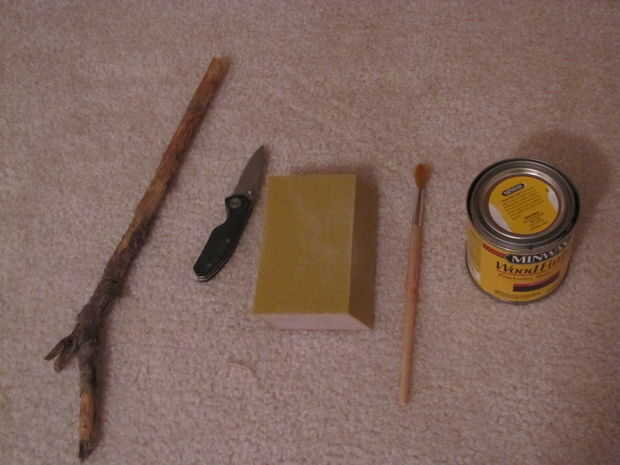Este proyecto es muy simple y sólo requiere unos pocos materiales obligatorios: un palo adecuado, un cuchillo whittling, papel de lija, al menos una de las opciones color de tinta para madera y una brocha. Dependiendo de tu nivel de habilidad, puede adquirir cualquier número de otras herramientas de carpintería, pero este instructable se adhieren a los conceptos básicos.