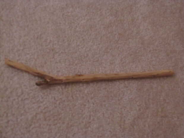 Ahora que han elegido su memoria perfecta o tal vez eligió, pues, como todos sabemos, la varita escoge al mago, es hora de empezar a tallar. En primer lugar, utilice su cuchillo whittling para toda la corteza de la parte exterior del palo, como se muestra.