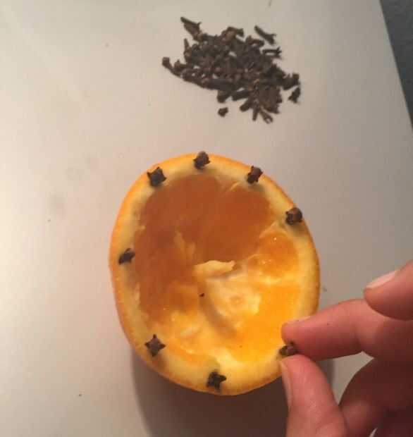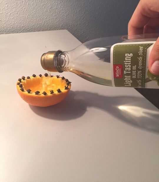 Decorar el vaso de naranja con semillas de clavo de olor; Vierta aceite de oliva en el vaso hasta que esté medio lleno. Asegúrese de que al pobre aceite en el vástago de la fruta así (la mecha de la vela).