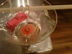 Como este max está derritiendo, creó el vidrio mediante la técnica de fieltro de palillos. Usted quiere verter pequeña cantidad de cera en el recipiente con el embudo, debe ser suficiente para cubrir la base de la mecha. La idea aquí es poner la mecha en su lugar antes que agregar la mayor parte de la vela.