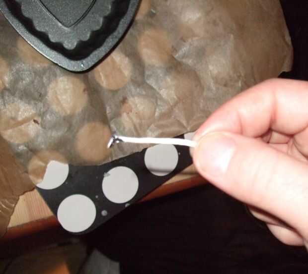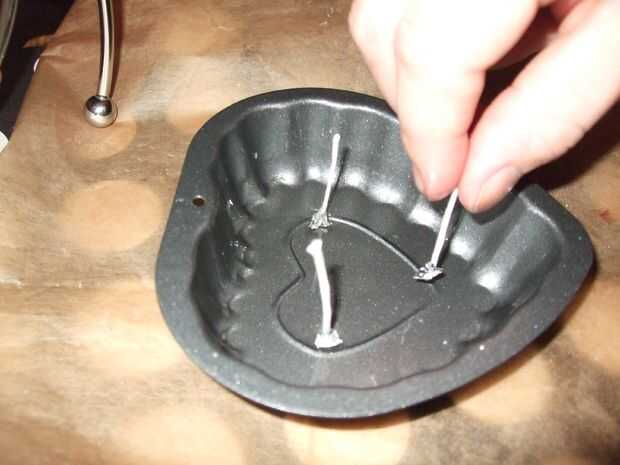 Mientras la cera se derretía preparar el molde, poner un poco de aceite alrededor de él, ayuda a detener la cera se adhiera. Para las mechas utilizan el viejo pabilo de la vela roja y cortar en 3 trozos, que luego puso un poco de papel de aluminio en el extremo de cada mecha a levantarse mientras vierte la cera.