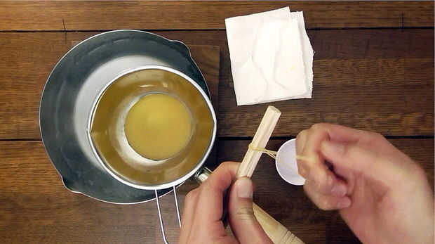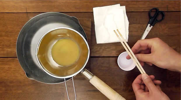 Atar los palillos con la goma y fijar la mecha de la vela con él.