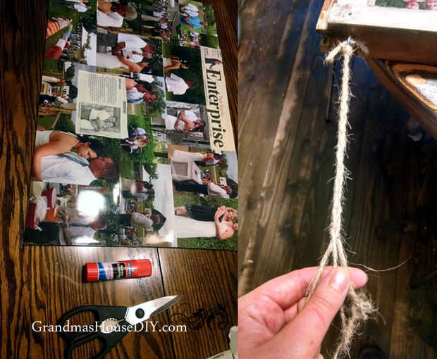 A partir de ahí cogí el palillo del pegamento de elmor también había recogido en walmart y tienes que pegar las fotos abajo. Tenía en el primer pensamiento acerca de cómo algunos spray de pegamento pero cuando vi este palillo del pegamento poco pensé que podría funcionar muy bien, y lo hizo. Una vez que se fue pegado abajo puse en la ventana y pone la ventana en la mesa para poder atornillar los ganchos de ojo y ponerse a trabajar en la guita. Ventanas de madera antiguas son pesados, así que decidí trenza la guita por lo que era triple de la fuerza de un solo filamento. Los ganchos de ojo usé clasificaron 55 libras pero me sentí bien acerca de ellos sólo porque la madera en el marco de la ventana que había atornillado en fue muy sólida y no de cualquier manera dañado por el tiempo etc..