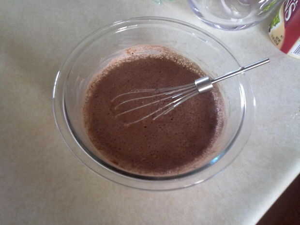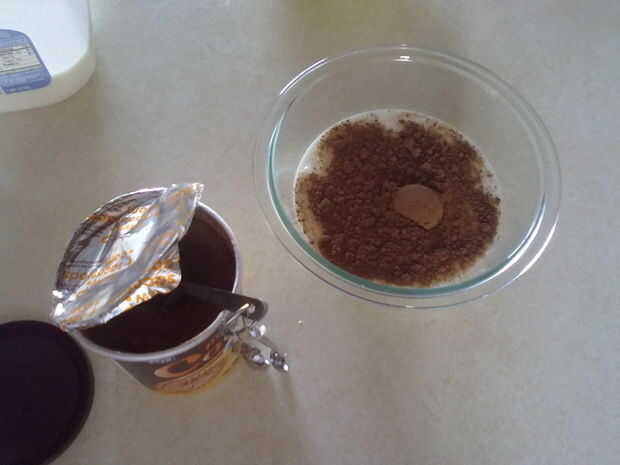 Mezclar el cacao en polvo en la leche.  (Esto es realmente hasta cuánta leche haya depositado en la taza y cuánto gusta el chocolate. Generalmente uso un recipiente y poner en 2 cucharadas de cacao en polvo.)
