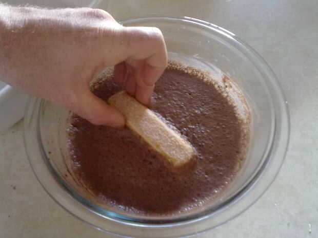 Mojar una mitad de una galleta savoiardi en la mezcla de chocolate con leche.