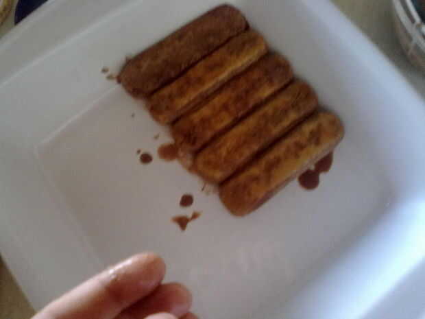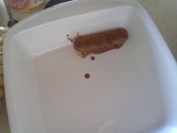 Una vez que ha sumergido la cookie completa, colóquelo en la bandeja de 9 x 9. (Querrás comience en un borde y llenar como te va. Usted quiere un producto denso en el extremo, así que asegúrese de que las cookies estén ajustadas uno contra el otro. Si hay lagunas puede romper las cookies para ayudar a llenar esos vacíos.)