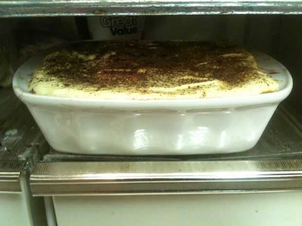 Coloque su nuevo pan de 9 x 9 de tiramisú en el frigorífico.  (El tiramisú necesita reposar en la nevera al menos 4 horas.  Si quieres un sabor mejor a continuación, debe permanecer en 8 horas.)