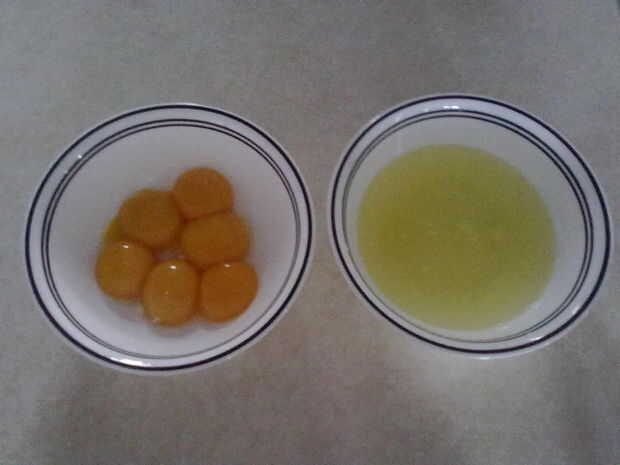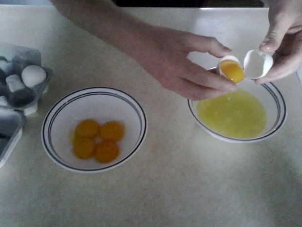 En primer lugar, en dos recipientes apartes, separar 6 huevos poner las yemas en un bol y las claras de huevo en otro. (Si usted tiene una yema de huevo romper contigo... no es un gran problema, trate de obtener la menor cantidad de yema en el huevo y seguir. Usted querrá asegurarse de que ambos recipientes son lo suficientemente grandes como para hacer alguna mezcla más tarde. Si eres como yo y a veces se olvide luego simplemente moverlos a un bol más grande.)