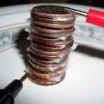 Coloque un círculo de la tarjeta en una lavadora de zinc, entonces un centavo en el círculo de la tarjeta. Pila de otro círculo de la tarjeta en el penique entonces una arandela en la parte superior. Repita el proceso hasta que quede una pulgada de alto. Asegúrese de que es un duro en la parte superior de la pila.