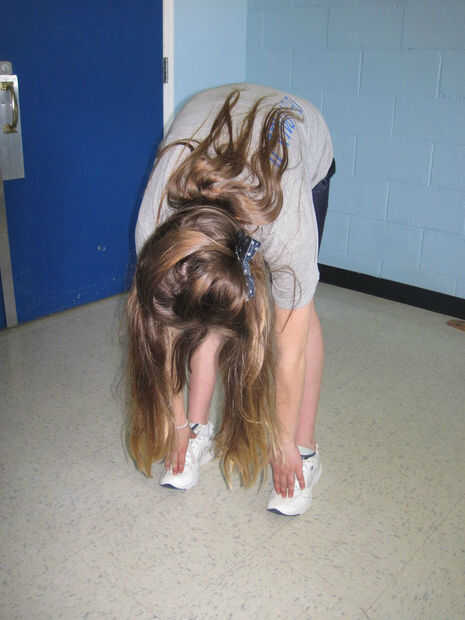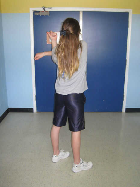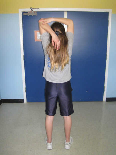 Sostenga su codo y puso que sus manos sobre su cabeza intentan tocar la espalda.