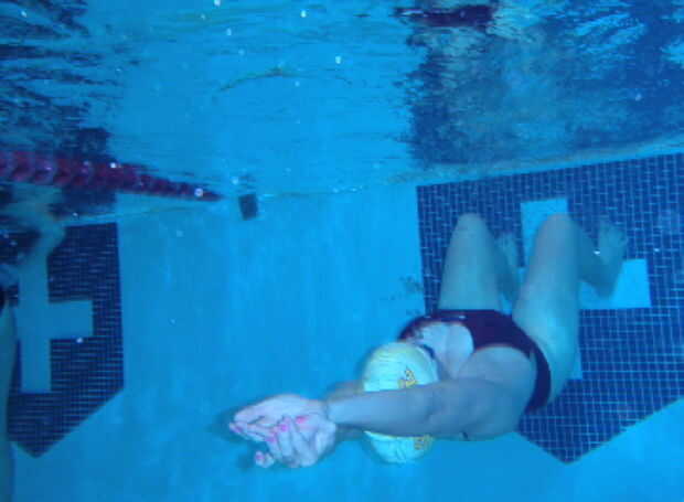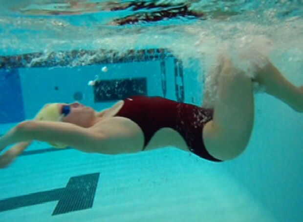 Extender las piernas fuera de la bola encrespada y plantarlas directamente en la pared aproximadamente 6" bajo la superficie del agua, los dedos del pie hacia arriba. Como llegar mejor, tienes que ser lo suficientemente cerca de la pared que las caderas y las rodillas están ambos haciendo ángulos de 90 grados, como estás sentado recto para arriba en una silla.