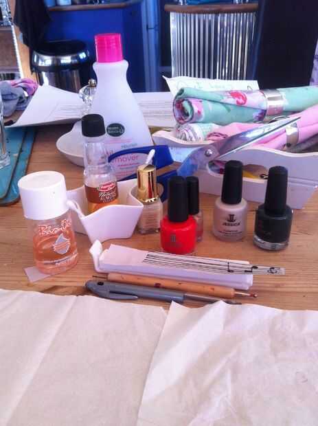 Necesitas: aceite de bebé / almendra extracto / alcohol (yo usé almendra extracto) para frotar un recipiente pequeño (utilicé un plato pequeño para castañas de cajú) un color pálido (utilicé un blanco cremoso) una pluma (utilice un bolígrafo o la tinta se ejecutará) capullos de algodón (q-TIP) regla (o un objeto recto) tira de esmalte de uñas tijeras claro periódico llano (corte desde el borde) opcional extra : Que herramienta (de corazones) clavo rojo barniz negro esmalte debajo de la capa de removedor de esmalte de uñas (en caso de un error)