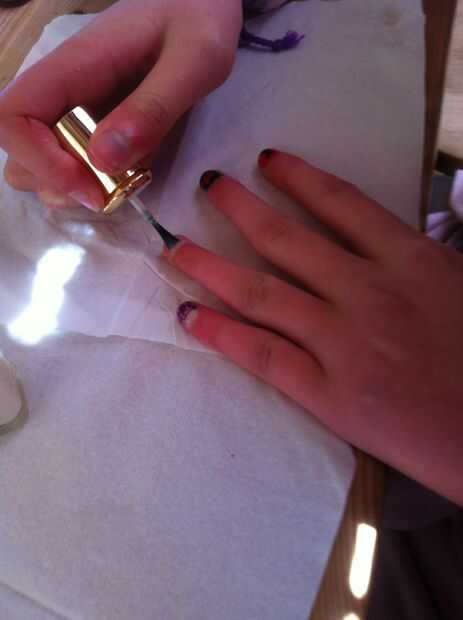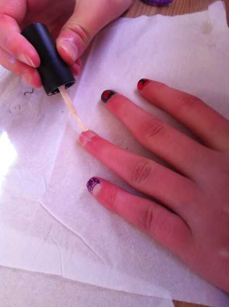 Pintar las uñas en el color que quieras. Hice el pulgar y los dos últimos dedos blanco negro con un corazón rojo y el otro dedo rojo con una 'I' negro dedo del medio.