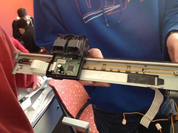 5. nosotros no necesitamos la tarjeta de circuitos de la unidad de cabeza. Puede haber una manera que podría bajar sin cortarla o romperla. Finalmente se extrajeron el armazón del apoyacabeza impresora atado a la barra de precisión y tiene motor en el mismo. Podemos usar esta parte para construir el eje XY para la impresora 3D.