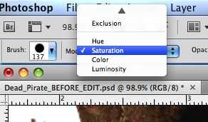 Para este paso su tiempo para hacer un fantasma como el cutis, después de todo la mayoría fantasmas no se ven natural y bronceado como se ve en la imagen original. Empezar con la herramienta Pincel, sino debe establecerse en modo de saturación con el fin de aclarar la tez en lugar de color u oscurecerlo. Para ello a todo carnosas áreas. Luego tomar la herramienta y oscurecer áreas para hacer sombras y para intensificar la imagen. También puede haga clic en el botón y manténgalo hasta conseguir la herramienta dodge para aligerar las áreas.