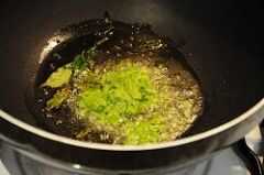 Calor 2 a 3 cucharaditas de aceite en una olla pequeña. Añade 1/2 cucharadita de mostaza, hojas de curry de 7 a 8 y los crujidos.