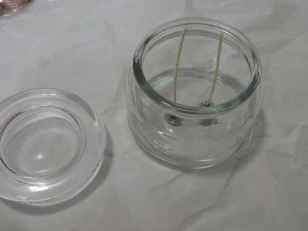 • Abierto el tarro de masón y lugar une la mecha encerada con lengüetas de mecha en el centro de la jarra.