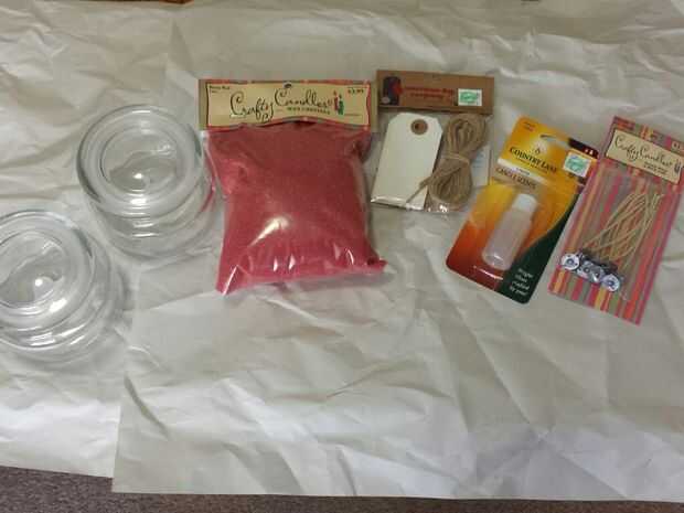 Materiales:1 bolsa ZiplocMecha encerada con mecha fichas adjuntadasVela aroma (líquido)1 bolso de cristal de cera granuladaTarro de masón (opcional) cinta o paquete de decoración del manila artesanal** El precio total de compra de los materiales será