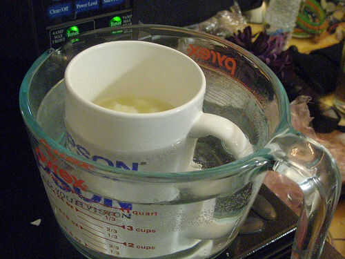Una vez que en su mayoría se haya derretido, usé la cuchara para revolver hasta que todos los cheques fueron disueltos y se enfríe la cera un poco.